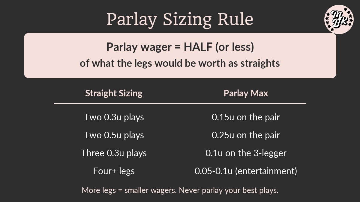 The Quick Rule of Thumb: At minimum, your parlay wager should be HALF (or less) of what the legs would be worth as straights.